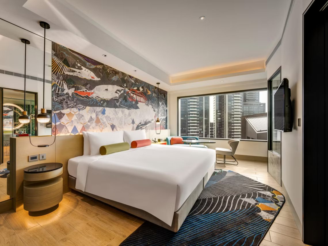 The façade of Hotel Indigo Taipei North showcases an elegant spiral of handcrafted Japanese bricks, totaling 520,000 pieces. Distinctive triangular windows are neatly arranged, resembling the scales of a dragon. Inside, immerse yourself in local narratives—the history of bricks, the vibrancy of dragon boats, the flowing Keelung River and the charming riverside life of duck farmers. Contemporary colors interwoven with Dazhi's cultural tapestry create an immersive cultural experience, whether you're staying, dining or hosting events.